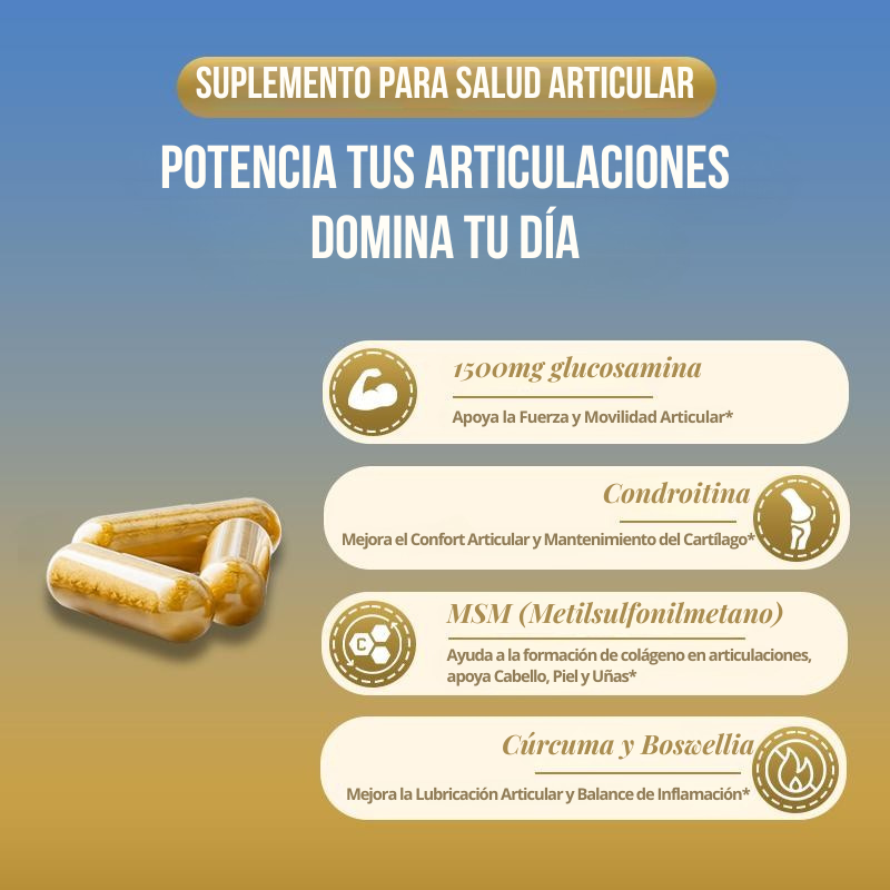 La mayoría de los suplementos de glucosamina tienen dosis bajas (500mg vs nuestros 1500mg) o les faltan los ingredientes sinérgicos como condroitina, MSM y boswellia. Nuestra fórmula incluye dosis clínicas de todos los ingredientes probados, no solo un compuesto.