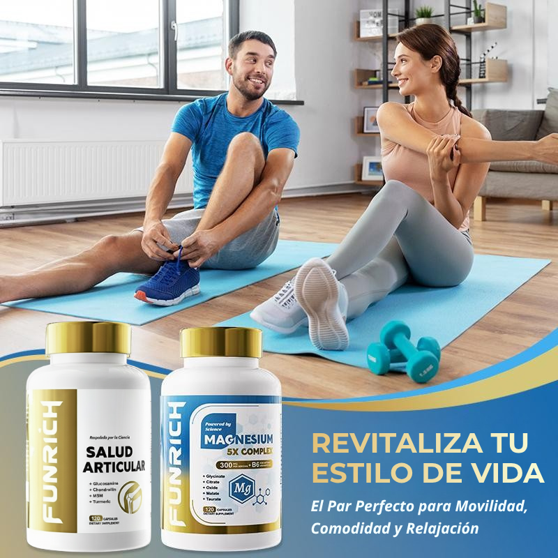 El dolor articular tiene dos causas: cartílago dañado Y inflamación crónica. La fórmula articular reconstruye la estructura mientras el magnesio reduce la tensión muscular y la inflamación. Tomar ambas aborda el problema completo, no solo la mitad.